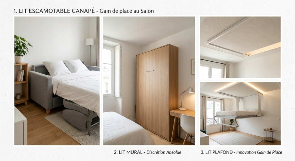 | Canapé-Lit Escamotable | Canapé convertible | 400 – 700 € | Double usage, design |