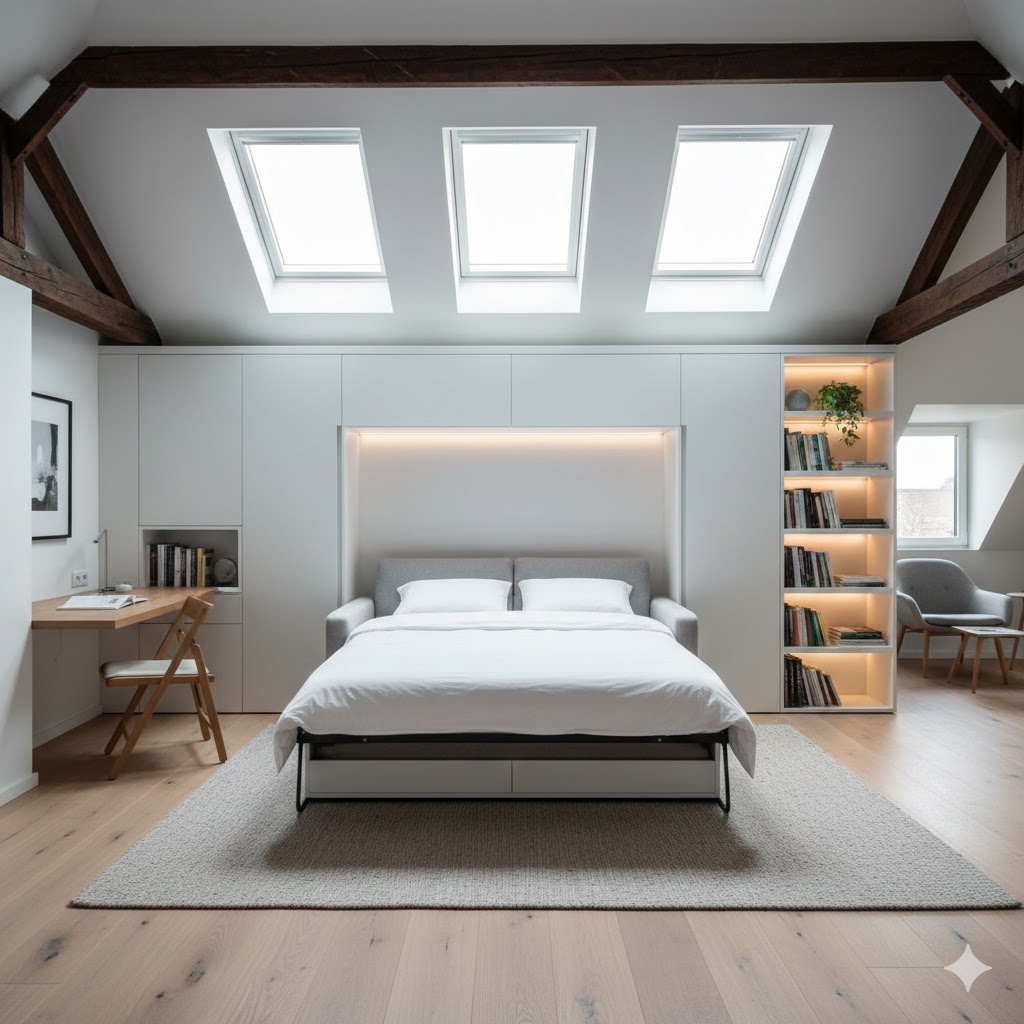 Une autre option intéressante consiste à intégrer le lit escamotable dans un meuble sur mesure comprenant des étagères, des armoires basses ou même un bureau. On crée ainsi un ensemble compact qui exploite au maximum l’espace disponible. Dans les greniers particulièrement petits, c’est une excellente alternative, car elle permet de concentrer plusieurs fonctions sur un même mur.